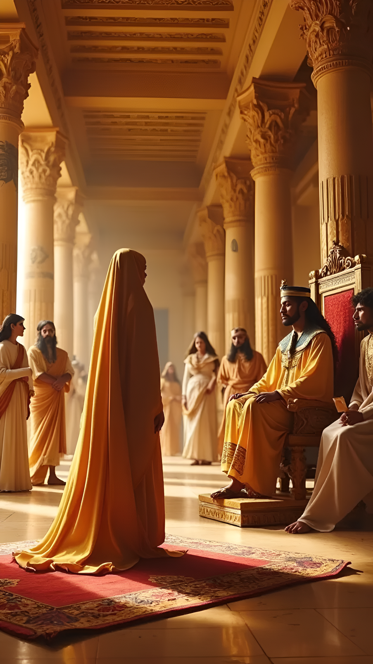 The woman standing on the left is bowing politely, and the pharaoh on the left is nodding his head slightly. Keep the screen still.