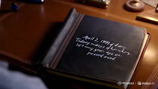 1999년 갈색 낡은 책상이 중심에 위치하고 있으며, 조명이 부드럽게 책상의 표면을 비추고 있다. 책상 위에는 검정 다이어리가 펼쳐져 있고, 다이어리의 페이지에는 손글씨로 "1999년 4월 2일. 오늘이 16년 전 아들이 죽어간 날이다"라는 문구가 적혀 있다. 카메라는 다이어리에 타이트하게 포커스를 맞추고 있으며, 다이어리의 질감과 글씨의 세밀함이 잘 드러난다. 첫 3초 동안, 다이어리의 문구가 화면 중앙에 고정되어 있으며, 조명이 따뜻한 느낌을 주어 감정적인 분위기를 자아낸다. 이어서, 다이어리의 페이지가 자연스럽게 앞으로 후루룩 넘어가는 장면으로 전환된다. 이때 카메라는 살짝 위에서 아래로 이동하며 페이지가 넘어가는 모습을 따라가고, 배경의 흐릿한 책상 위의 작은 소품들이 함께 비춰진다. 전체적인 분위기는 애틋하고 서정적이며, 잔잔한 음악이 배경에 깔려 감정을 더욱 고조시킨다.