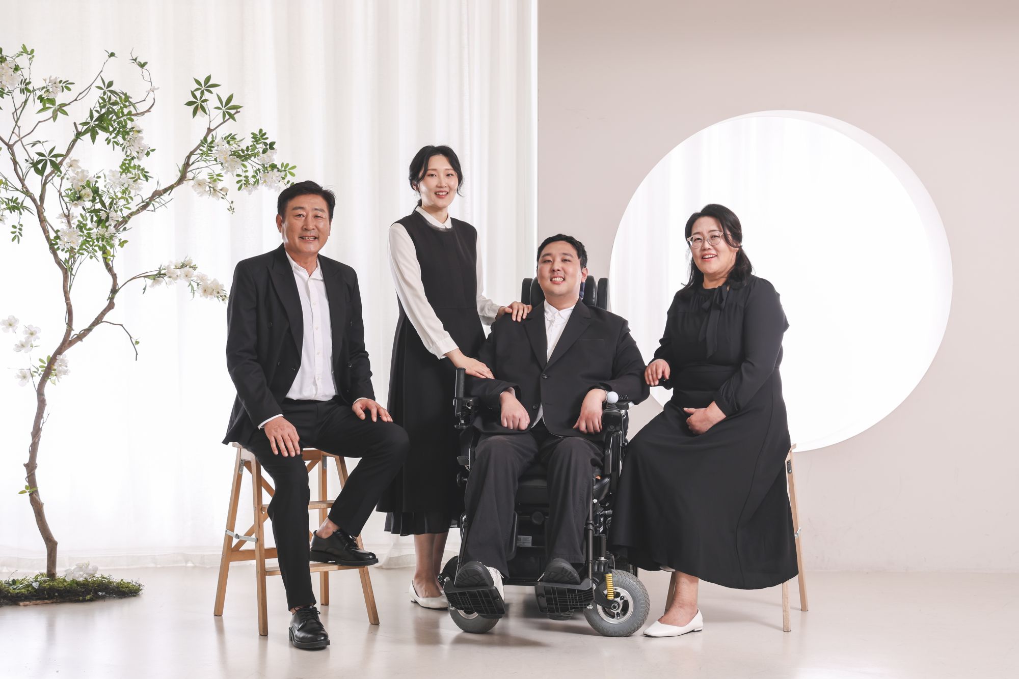 가족사진 찍는 스튜디오 사진에 나오는 4명이 웃으며 자세를 취한다 휠체어에 앉아있는 남자도 휠체어 없이 서있는 자세로 바꾼다 키는 184cm