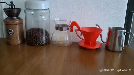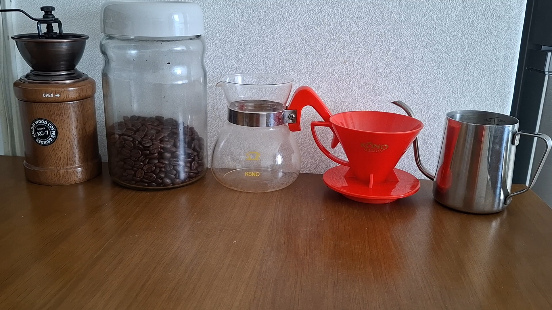 집에서 커피를 내리는 영상 필요한 기물을 먼저 보여주고 커피를 내림 사람은 안 나오게 원두는 30g 사용 커피는 300ml 추출