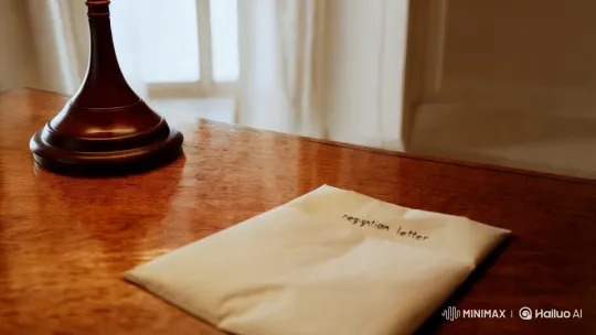 책상 위에 놓여 있는 사직서에 초점을 맞춘 5초 길이의 짧은 동영상 장면을 묘사합니다. 오래된 나무 책상 위에는 사직서라고 적힌 힌 봉투가 중앙에 놓여 있고 배경은 밝은 색상의 벽과 큰 창문으로 구성되어 있어 자연광이 부드럽게 들어오고 있습니다. 조명은 따뜻한 톤으로 설정되어 있어 아늑한 분위기를 자아냅니다. 카메라는 사직서를 클로즈업으로 촬영하며, 서서히 책상 위에서 사직서로 이동하는 부드러운 팬(pan) 움직임을 사용합니다. 사직서의 내용이 잘 보이도록 카메라가 약간의 줌(zoom) 효과를 주어, 글씨가 선명하게 드러나도록 합니다. 이 장면은 감정적인 긴장감을 전달하며, 사직서의 중요성을 강조하는 느낌을 줍니다.