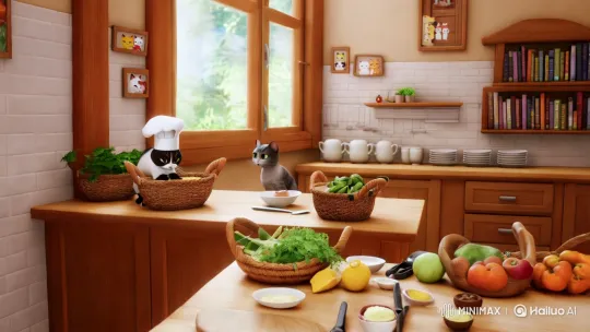 짧은 동영상 장면: 주방에서 고양이가가 요리하는 모습 배경: 아늑한 주방, 따뜻한 색조의 나무 가구와 화이트 타일로 꾸며진 공간. 주방 한쪽에는 신선한 재료들이 담긴 바구니와 식기세트가 정돈되어 있다. 창문을 통해 부드러운 햇살이 들어와 주방을 밝히고 있다. 주변 환경: 주방 조리대 위에는 다양한 재료들이 놓여있고, 강아지 요리사가 사용하는 조리 도구들이 정리되어 있다. 벽에는 요리책과 강아지 관련 그림들이 걸려 있어 아기자기한 분위기를 더한다. 조명과 분위기: 자연광이 주로 사용되며, 따뜻하고 포근한 느낌을 주는 조명이 주방 공간을 부드럽게 비춘다. 전체적으로 아늑하고 친근한 분위기가 감돈다. 카메라 샷의 종류와 움직임: 카메라는 중간 거리에서 시작하여 강아지 요리사의 전신을 보여준다. 강아지가 재료를 섞는 장면으로 카메라가 천천히 줌인하며, 강아지의 표정과 손놀림을 클로즈업한다. 마지막에는 카메라가 살짝 위로 이동하여 조리대 전체를 보여주며, 강아지가 요리를 완성하는 모습을 담는다.