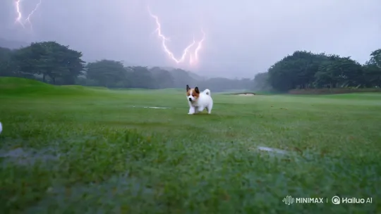 짧은 동영상 장면: 비가 내리는 날, 푸른 잔디로 가득한 골프장 한가운데에서 귀여운 강아지가 골프공을 향해 뛰어가는 모습. 강아지는 흰색과 갈색의 털을 가진 한국 강아지로, 귀가 쫑긋 서 있고 눈이 반짝인다. 배경: 잔디밭은 촉촉하게 젖어 있으며, 주변에는 울창한 나무와 비에 젖은 골프 코스의 경치가 펼쳐져 있다. 멀리 보이는 구름은 회색빛으로 가득 차 있고, 간간이 번개가 치며 비가 내리는 소리가 들린다. 조명과 분위기: 흐린 날씨로 인해 자연광이 부드럽고 은은하게 퍼져 있으며, 비가 내리면서 공기 중에 물방울이 반짝인다. 전체적인 분위기는 신비롭고 동화 같은 느낌을 준다. 카메라 샷: 카메라는 낮은 앵글에서 강아지를 클로즈업으로 촬영하며, 강아지가 골프공을 향해 달려가는 모습을 포착한다. 카메라는 강아지의 발이 잔디에 닿는 순간을 스윕하며 따라가고, 강아지가 공에 도달했을 때에는 짧은 줌 인으로 강아지의 행복한 표정을 강조한다. 마지막에는 강아지가 골프공을 물고 돌아오는 모습으로 전환되며, 카메라는 상반신 샷으로 강아지의 귀여운 모습과 비를 맞으며 즐거워하는 표정을 담는다.
