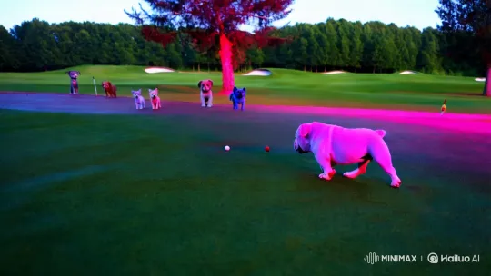 짧은 동영상 장면: 맑은 날씨 골프장 한가운데에서 귀여운 강아지핑크불독이 골프를 치면서 홀인원을 했다 배경과 주변 환경: 배경에는 푸른 잔디와 골프 홀의 풍경이 펼쳐져 있습니다. 멀리에는 나무들이 우거져 있고, 귀여운 강아지들 의 환호성 소리가 들린다 조명과 분위기: 맑은 날씨 속에서 자연광이 부드럽게 퍼져 있습니다. 강아지의 털이 빗방울에 젖어 더욱 밝게 빛나는 모습이 강조되어, 귀여움과 사랑스러움이 돋보입니다. 전체적으로 아늑하고 따뜻한 느낌을 주는 분위기입니다. 카메라 샷의 종류와 움직임: 카메라는 처음에 고정된 샷으로 강아지가 골프공을 향해 달려가는 모습을 담고 있다가, 강아지가 홀인원하는 순간에 맞춰 카메라가 살짝 팬(pan)하며 따라갑니다. 마지막에는 강아지의 표정과 귀여운 행동을 강조합니다.