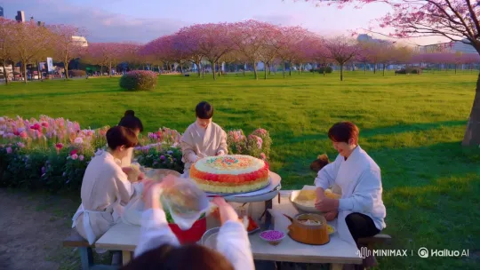 짧은 동영상 장면: 도심의 작은 공원에서, 여러 명의 한국인들이 모여 거대한 케이크를 만드는 모습. 배경 및 주변 환경: 공원은 푸른 잔디로 덮여 있고, 주위에는 화려한 꽃들이 만개해 있다. 멀리 보이는 나무들이 바람에 살랑거리고, 하늘은 맑고 푸르며, 몇 개의 구름이 흘러간다. 공원 한쪽에는 작은 테이블이 놓여 있고, 그 위에는 다양한 색상의 재료들이 흩어져 있다. 조명과 분위기: 햇살이 따뜻하게 비추는 오후 시간대, 자연광이 부드럽게 퍼져 있어 아늑하고 즐거운 분위기를 만들어낸다. 사람들의 웃음소리와 케이크를 만드는 소리가 어우러져 활기찬 느낌이 난다. 카메라 샷의 종류와 움직임: 카메라는 처음에 넓은 앵글로 공원의 전경을 보여주며 시작한다. 그 후, 점차 줌 인하여 작은 테이블에 집중한다. 테이블 위에서 한국인들이 함께 협력하여 거대한 케이크를 만들고 있는 모습이 클로즈업으로 잡힌다. 카메라는 사람들의 손길, 재료를 섞는 장면, 그리고 완성된 케이크의 세부 사항을 부드럽게 따라가며 촬영한다. 마지막에는 케이크를 완성한 후, 모두가 기뻐하며 서로를 축하하는 장면으로 마무리된다.