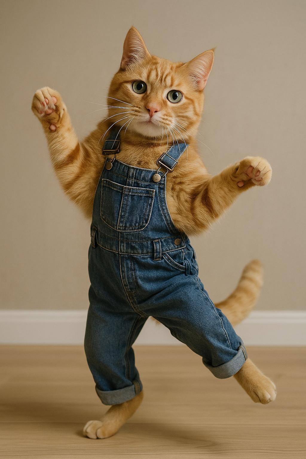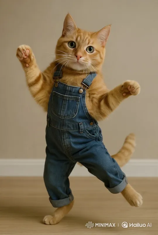 도심의 한복판, 화창한 오후의 풍경을 배경으로 한 장면. 고양이는 화려한 멜방바지를 입고 있으며, 그 바지는 바람에 살랑거려 더욱 경쾌한 느낌을 준다. 고양이는 넓은 보도 위에서 빠른 비트의 음악에 맞춰 신나게 춤을 추고 있다. 배경에는 현대적인 고층 빌딩들이 즐비하게 서 있고, 거리에는 사람들이 오가며 고양이의 춤을 흥미롭게 바라보고 있다. 주변에는 푸른 나무와 화단이 있어 도심 속에서도 자연의 느낌이 느껴진다. 조명은 자연광이 주를 이루며, 햇살이 고양이의 털과 멜방바지에 반사되어 반짝인다. 분위기는 경쾌하고 활기차며, 거리의 소음과 음악이 어우러져 즐거운 느낌을 자아낸다. 카메라 샷은 고양이를 중심으로 한 클로즈업과 함께, 고양이가 춤을 추는 모습을 담기 위해 부드럽게 팬(pan)하며 이동한다. 때때로 고양이가 점프하거나 회전할 때, 카메라는 저조도에서의 고속 촬영처럼 빠르게 전환되어 고양이의 동작을 강조한다. 전체적으로 5에서 10초 길이의 짧은 클립으로, 고양이의 유쾌한 매력을 잘 담아낸다.
