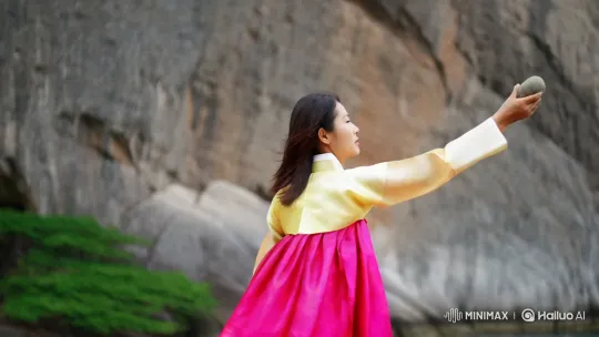 거칠고 우뚝 솟은 바위 절벽이 배경을 이루고 있다. 바위의 표면은 세월의 흔적이 남아 있어 거칠고 날카로운 모습이다. 화면 중앙에는 한복을 입은 삼십대 한국인 여인이 뒷모습으로 서 있다. 여인은 오른손에 작은 돌을 쥐고 있으며, 왼쪽으로 몸을 약간 틀어 바위 절벽을 향해 던지는 동작을 취하고 있다. 그녀의 긴 머리카락은 바람에 흩날리며, 고요한 분위기 속에서 그녀의 집중된 모습이 드러난다. 카메라는 바스트 샷으로, 여인의 상반신을 중심으로 잡고 있으며, 약간의 줌 인 효과로 그녀의 손과 돌에 집중하고 있다. 카메라는 여인의 던지는 동작에 맞춰 부드럽게 패닝하며, 그녀의 뒷모습과 바위 절벽을 함께 담아낸다.