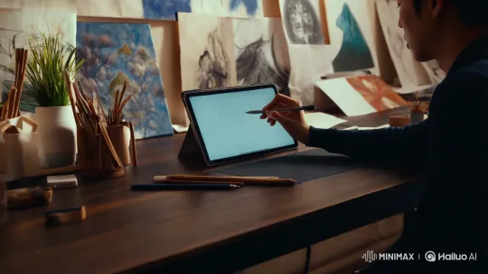 짙은 나무 테이블 위에 놓인 태블릿과 스타일러스 펜이 보인다. 태블릿 화면에는 한국인 아티스트가 그림을 그리는 모습이 나타나고, 그의 손이 펜을 쥐고 섬세하게 선을 그려내고 있다. 배경은 아늑한 작업실로, 벽에는 다양한 그림과 스케치가 걸려 있고, 창으로 들어오는 부드러운 자연광이 작업실을 따뜻하게 비추고 있다. 카메라는 아티스트의 손과 태블릿 화면을 클로즈업하여, 세밀한 작업 과정을 강조한다. 마지막으로, 태블릿 화면에 그려진 그림이 점점 완성되어 가는 모습을 보여주며, 아티스트의 손이 마지막 터치를 추가하는 장면으로 마무리된다.