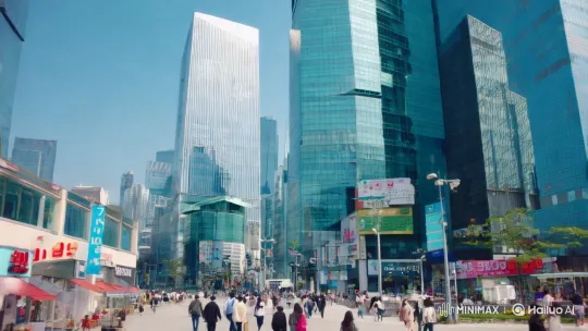 짧은 동영상 장면: 화면은 현대적인 도시의 전경으로 시작된다. 고층 빌딩들이 줄지어 서 있고, 그 사이로 사람들이 바쁘게 오가는 모습이 보인다. 배경에는 파란 하늘과 흰 구름이 떠 있으며, 햇살이 빛나고 있다. 카메라는 천천히 줌 아웃하며 도시의 전경을 넓게 보여준다. 조명은 자연광으로, 태양의 따뜻한 빛이 도시를 감싸고 있어 밝고 활기찬 분위기를 연출한다. 거리의 사람들은 다양한 활동을 하고 있으며, 한국인 남녀가 스마트폰을 들고 서로 대화하는 모습이 클로즈업으로 잡힌다. 그들은 미소를 지으며 서로의 의견을 나누고 있으며, 주변의 다양한 상점과 카페들이 배경으로 보인다. 카메라는 그들의 대화 장면에서 천천히 패닝(panning)하여 주변의 사람들과 거리 풍경을 포착한다. 이 장면은 콘텐츠 산업의 성장과 연결된 현대인의 삶을 상징적으로 보여주며, 사람들의 소통과 연결을 강조한다. 마지막으로, 카메라는 다시 도시 전경으로 돌아가며, "세계 콘텐츠 산업의 성장"이라는 텍스트가 화면에 나타난다.