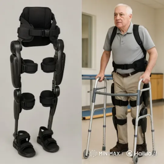 혼자 거동이 불가능한 노인들이 거동 보조 목적으로 사용하는 하지보조기구 알지? 배경은 요양원의 어느 치료실이고 독립 거동이 불가능한 한 노인이 보조 기구를 착용하고 치료보호사와 함께 거동 훈련을 하고 있는 모습이 필요해. 단, 해당 기구는 착용감이 체형에 맞지 않아서 상당히 힘든 상황이고 그게 표정이나 행동에서 드러났으면 좋겠어. 또한 여러 노인들의 거동 보조 치료를 위해서 치료보호사들이 매번 그 기구의 셋팅을 바꿔야하며 그에 따른 소요시간이 증가하는 장면도 추가해주면 좋겠어.