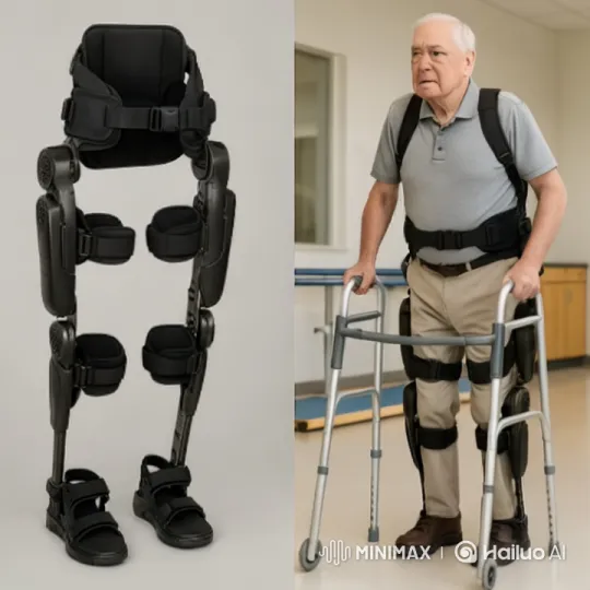첨부 이미지의 할아버지가 직접 움직이는 동영상으로 제작해줘. 저 할아버지는 혼자서 걷질 못해서 저 기구에 의존하여 걸음 훈련을 하고 있어. 치료보호사가 옆에서 함께하고 있지만 거동 훈련은 할아버지 혼자서 어떻게든 해보려고 하고있어. 다만 기구 착용감이 불편해서 걸음마다 상당히 찡그린 표정을 짓고 있어야해.