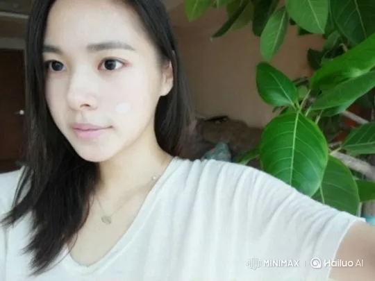 아늑한 집 안에서 하얀 티셔츠를 입고 셀카를 찍고 있는 한국인 여자친구의 모습. 그녀는 차분하게 웃는 미소를 지으며 브이하면서 카메라를 바라보고 있다