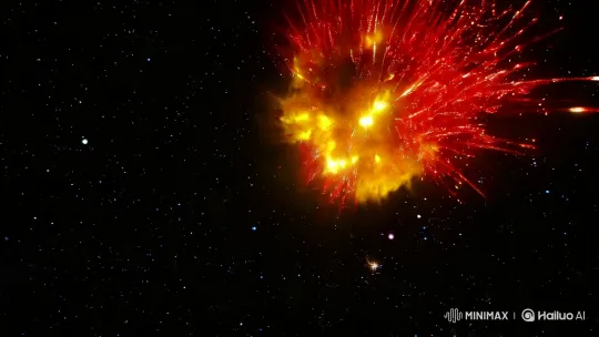 우주에서의 최초 폭발 장면을 담은 5초 길이의 동영상. 배경은 깊은 우주로, 수많은 별들이 반짝이고 있으며, 먼 은하들이 흐릿하게 보인다. 중앙에는 거대한 폭발이 일어나고 있으며, 불꽃과 에너지가 방사형으로 퍼져나가는 모습이 생생하게 표현된다. 폭발의 중심부는 밝은 오렌지색과 노란색으로 타오르며, 주변은 붉은색과 보라색의 에너지 파동으로 가득 차 있다. 조명은 폭발의 밝은 빛에 의해 주로 이루어지며, 주변의 어두운 우주 배경과 강렬한 대비를 이루고 있다. 전체적인 분위기는 경이로움과 긴장감이 교차하며, 시청자에게 우주의 신비로움과 힘을 전달한다. 카메라 샷은 폭발을 중심으로 하는 클로즈업으로 시작하여, 폭발의 세부적인 텍스처와 색감을 강조한다. 이후 카메라는 서서히 뒤로 물러나며, 폭발이 우주에서 얼마나 거대한지를 보여주는 와이드 샷으로 전환된다. 카메라의 움직임은 부드럽고 자연스럽게 진행되며, 폭발이 확산되는 과정을 따라가며 우주의 광활함을 더욱 부각시킨다.