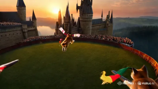 고요한 저녁, 해가 지고 있는 호그와트 성 위에서 마법적인 퀴디치 경기가 펼쳐진다. 경기장은 하늘 높이 떠 있는 듯한 느낌을 주며, 두 팀의 고양이들이 빗자루를 타고 빠르게 날아다닌다. 각 고양이는 팀 스카프를 휘날리며, 바람에 흩날리는 털이 신비로운 분위기를 더한다. 배경에는 화려한 호그와트 성의 탑들이 따뜻한 빛으로 물들어 있으며, 그 주위에는 마법에 걸린 관중들이 모여 있는 경기장이 보인다. 관중들은 열광적으로 응원하며, 다양한 색상의 스카프를 두르고 있는 고양이들이 하늘을 가로지르는 모습이 눈에 띈다. 카메라는 다이나믹한 앵글로 고양이들이 공중에서 역동적인 기동을 펼치는 모습을 포착한다. 때때로 카메라가 빠르게 이동하며 고양이들의 스릴 넘치는 비행을 따라가고, 클로즈업 샷으로 그들의 표정과 스카프가 휘날리는 모습을 강조한다. 조명은 황금빛으로 따뜻하게 비추며, 자유롭고 흥미진진한 분위기를 만들어낸다. 이 장면은 환상적이고 서사적인 스타일로, 마법의 세계에서 펼쳐지는 짜릿한 순간을 생생하게 담아낸다.