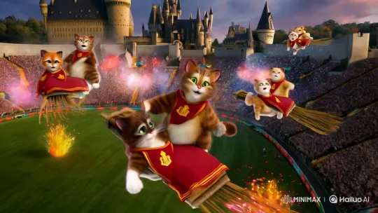 "The victorious Gryffindor cat team soars triumphantly above the Quidditch pitch, their red-and-gold scarves billowing in the wind. The team’s tabby captain raises its broomstick high in celebration, eyes gleaming with joy. Teammates swoop around it, exchanging playful head bumps and paw-fives midair. Confetti made of enchanted feathers drifts down like magical snow. The enchanted stadium erupts in a chorus of meows, cheers, and colorful bursts of spellfire as the Hogwarts castle glows warmly in the background. A sense of triumph and camaraderie fills the air. Highly detailed, cinematic, heartwarming fantasy style."
