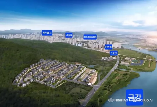 짧은 동영상 장면을 다음과 같이 구체적으로 묘사합니다. --- **장면 설명:** 세종시의 중심에 위치한 더 리버코트 단지를 배경으로 한 5초 길이의 동영상. 카메라는 부드럽게 드론 샷으로 시작하여, 단지 전경을 넓게 비춥니다. 푸른 숲과 금강이 어우러진 모습이 한눈에 들어옵니다. **배경 및 주변 환경:** 단지의 뒤편에는 울창한 숲이 자리하고 있으며, 앞쪽에는 금강이 흐르고 있습니다. 주변에는 현대적인 건축물과 함께 이마트, 코스트코 등의 생활 인프라가 보입니다. 햇살이 부드럽게 비추며, 나무 사이로 스며드는 빛이 자연의 아름다움을 강조합니다. **조명 및 분위기:** 따스한 자연광이 숲과 주택 단지를 감싸며, 아침의 청량한 분위기를 연출합니다. 잔잔한 바람이 느껴지는 듯한 소리가 배경에 깔리며, 자연과 조화로운 삶의 느낌을 전달합니다. **카메라 샷의 종류 및 움직임:** 드론 카메라가 천천히 하강하며 단지의 전경을 촬영합니다. 카메라는 부드럽게 회전하여 숲과 금강을 함께 담아내며, 마지막에는 단독형 주택의 외관을 클로즈업합니다. 이 과정에서 주택의 현대적인 디자인과 조경이 잘 드러납니다. --- 이렇게 구성된 동영상은 더 리버코트의 매력을 효과적으로 전달할 수 있습니다.