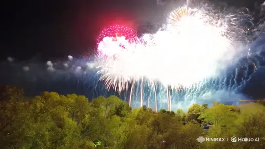 어두운 밤하늘을 배경으로, 화려한 불꽃놀이가 펼쳐지는 장면. 카메라는 낮은 각도에서 시작해 천천히 위로 올라가며 불꽃놀이의 전체적인 풍경을 포착한다. 조명은 불꽃의 다양한 색상으로 가득 차 있으며, 붉은색, 파란색, 노란색의 불꽃이 하늘을 수놓는다. 불꽃이 터질 때마다 주변이 밝아지며. 카메라는 불꽃이 터지는 순간을 클로즈업하여, 섬세한 불꽃의 형태와 그 속에서 나오는 불빛의 반사 효과를 강조한다. 배경에는 어두운 나무들이 실루엣처럼 드러나 있고, 멀리서 도시의 불빛이 희미하게 보인다. 불꽃놀이의 소음은 사람들의 환호성과 함께 어우러져 생동감을 더한다. 마지막으로, 카메라는 다시 전체 풍경으로 줌 아웃하며 불꽃놀이가 끝나는 순간을 담아낸다.