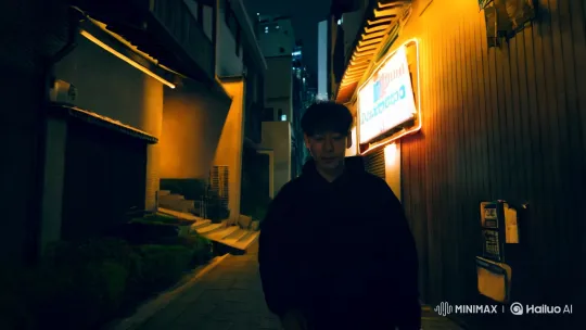 어두운 골목길에서 시작하는 장면. 한국의 전통적인 건축물과 현대적인 빌딩이 조화를 이루는 배경으로, 골목의 한쪽에는 화려한 네온사인이 반짝이고 있다. 카메라는 천천히 줌 인하며, 한 남성이 검은 후드티를 입고 등장한다. 그의 얼굴은 어둠 속에서 드러나고, 눈빛은 결단력이 느껴진다. 조명은 어두운 밤하늘을 배경으로 하여, 네온사인과 가로등의 따뜻한 빛이 남성의 얼굴을 부드럽게 비춘다. 분위기는 긴장감이 감돌며, 배경에서는 먼 발소리가 들린다. 남성은 한 손에 스마트폰을 들고, 화면에는 "AI 챗봇으로 소통하는 팬덤 커뮤니티"라는 메시지가 나타난다. 카메라는 그를 중심으로 회전하며, 그의 움직임에 따라 시선이 따라가게 한다. 장면이 전환되며, 자율주행 차량이 빠르게 지나가는 모습이 나타난다. 카메라는 차량의 측면을 따라가며, 차량의 유려한 디자인과 함께 "스타트업 투자로 이루어진 혁신"이라는 텍스트가 화면에 나타난다. 마지막 장면에서는 남성이 카메라를 바라보며 미소를 지으며 손짓을 한다. 그의 뒤편으로는 다양한 사람들이 함께 모여 있는 모습이 비춰지며, "메시징과 AI 챗봇으로 연결되는 새로운 미래"라는 메시지가 화면에 나타난다. 전체적으로 역동적이고 현대적인 느낌을 강조하며, K-POP의 에너지를 담아낸다.