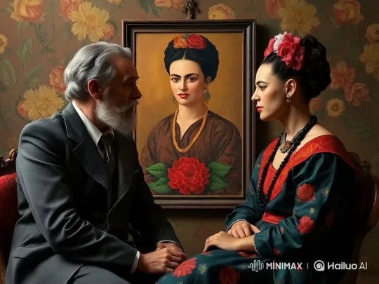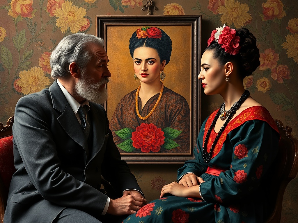 독일의 철학자 마르틴 하이데거와 멕시코의 화자 프리다 칼로가 철학적 대화를 나누고 있는 장면을 만들어 줘, 상황은 둘이 프리다 칼로가 그린 그림을 가지고 철학적 대화, 다시 말해 철학상담을 나누고 있는 장면이야.